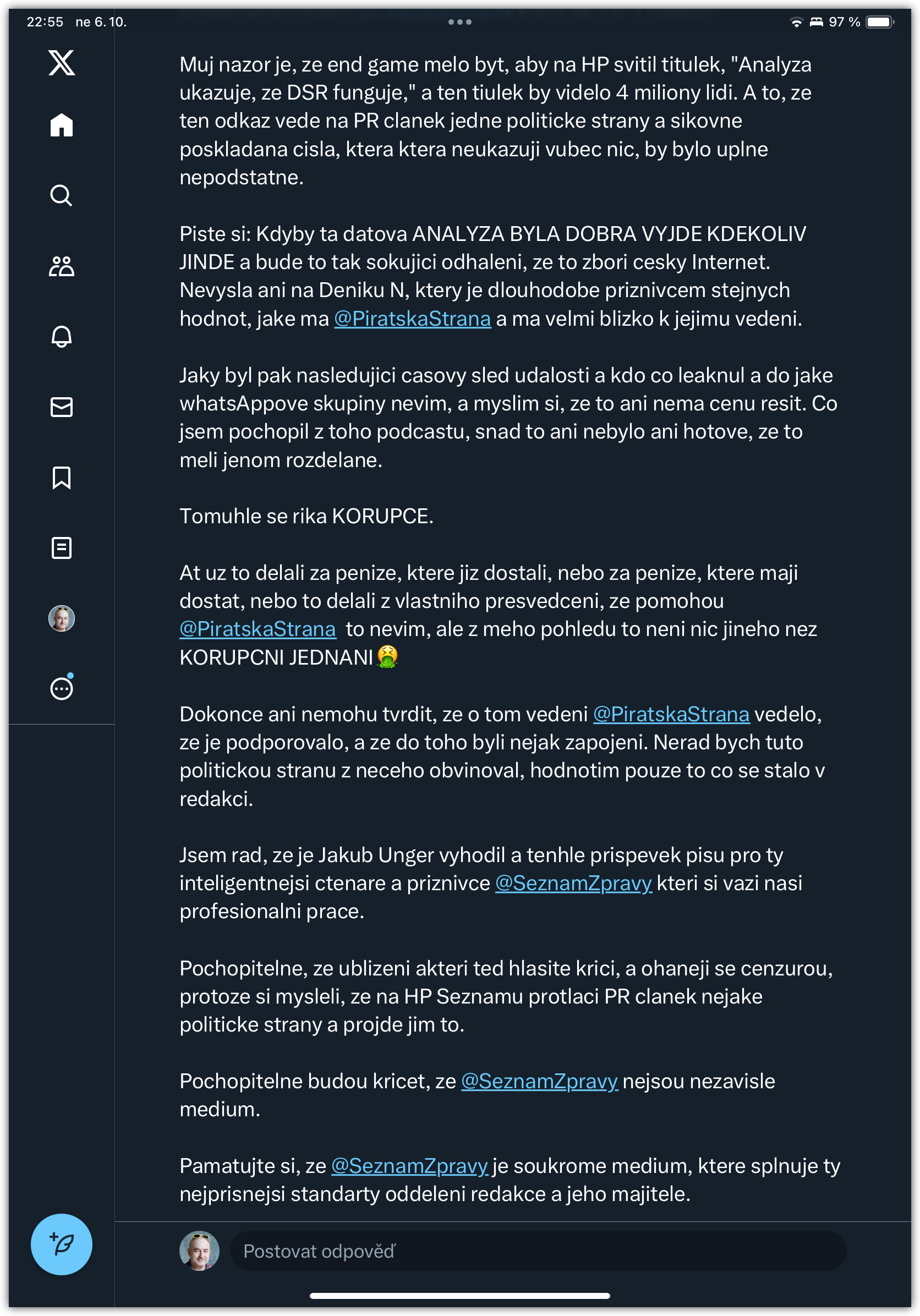 Ivo Lukačevič přesně po vzoru velkých bigtech bosů na Twitteru/X zveřejnil doslova několikastránkové “vyjádření”. Učebnicové, protože po jeho přečtení se nelze zbavit pocitu, že je to Seznam kdo má máslo na hlavě, Seznam kdo v tomto selhal. A Seznam, který je netransparentní.